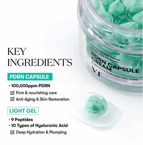 Vegan PDRN Refreshing cream infused with PDRN capsules that dive in a refreshing gel cream.